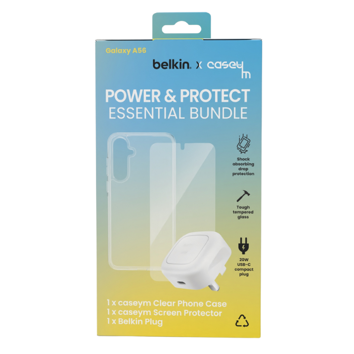 Essential protection, elevated. This bundle features a sleek CASEYM Clear Case crafted from 100% recycled materials, a crystal-clear screen protector with 60% recycled glass, and a compact 20W Belkin USB-C plug for fast, reliable charging. Smart, sustainable, and ready to go—no compromises.
