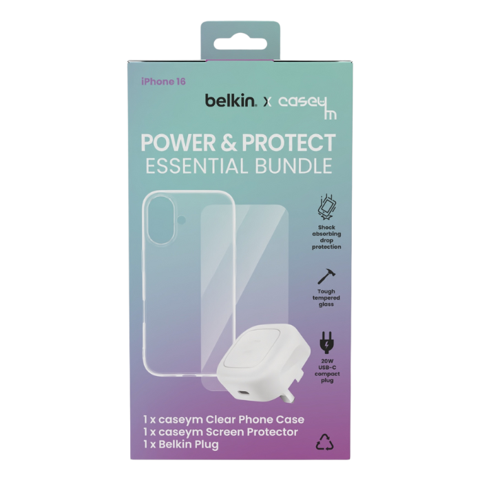 Essential protection, elevated. This bundle features a sleek CASEYM Clear Case crafted from 100% recycled materials, a crystal-clear screen protector with 60% recycled glass, and a compact 20W Belkin USB-C plug for fast, reliable charging. Smart, sustainable, and ready to go—no compromises.