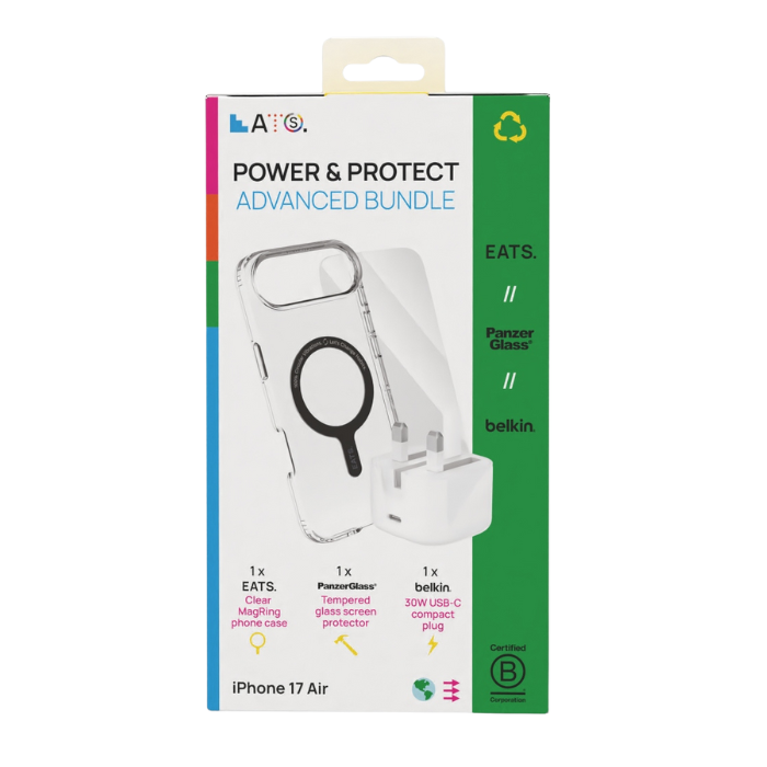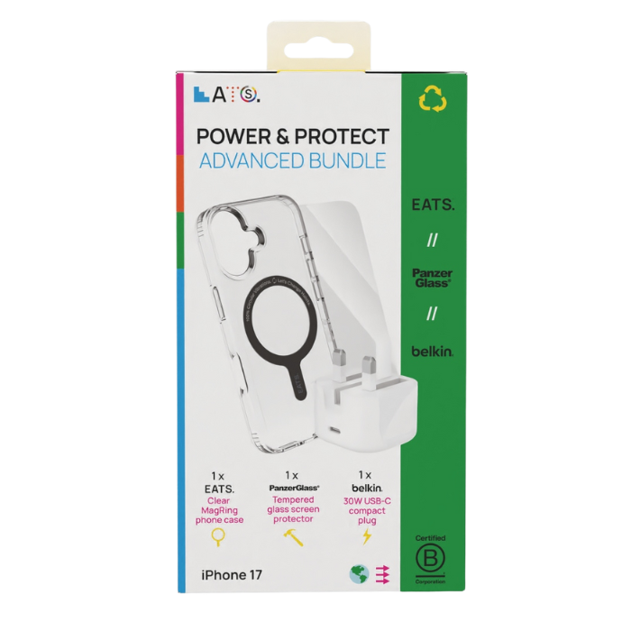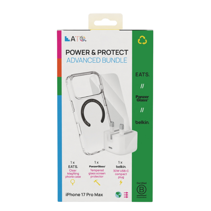Power up fast. Protect even faster. This advanced phone bundle includes an EATS, crystal-clear MagSafe-compatible case, an ultra-wide PanzerGlass® screen protector made with 60% recycled glass, and a Belkin 30W USB-C fast charger that gets you from 0–50% in just 24 minutes. Drop-tested, scratch-resistant, travel-ready, and made with recycled materials for less waste and more performance.